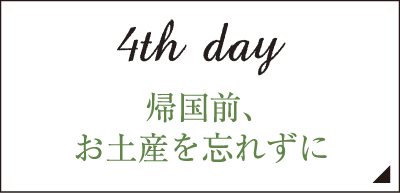 旅の最後はみんなへのお土産探し。品揃え豊富な広い店内を歩きまわり、あの人が喜ぶお土産を選びましょう。初日に見つけて悩んだものや、気になるお得なアイテムを手に入れるのもこれが最後のチャンスです。