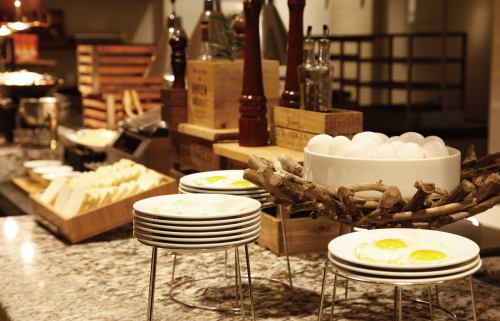 オープンキッチンから香ばしい香りが広がる店内で、ベーコンや卵、種類豊富な新鮮野菜などをビュッフェスタイルで楽しむことができます。落ち着いた雰囲気と美味しい料理で、爽やかな一日のはじまりをお過ごしください。